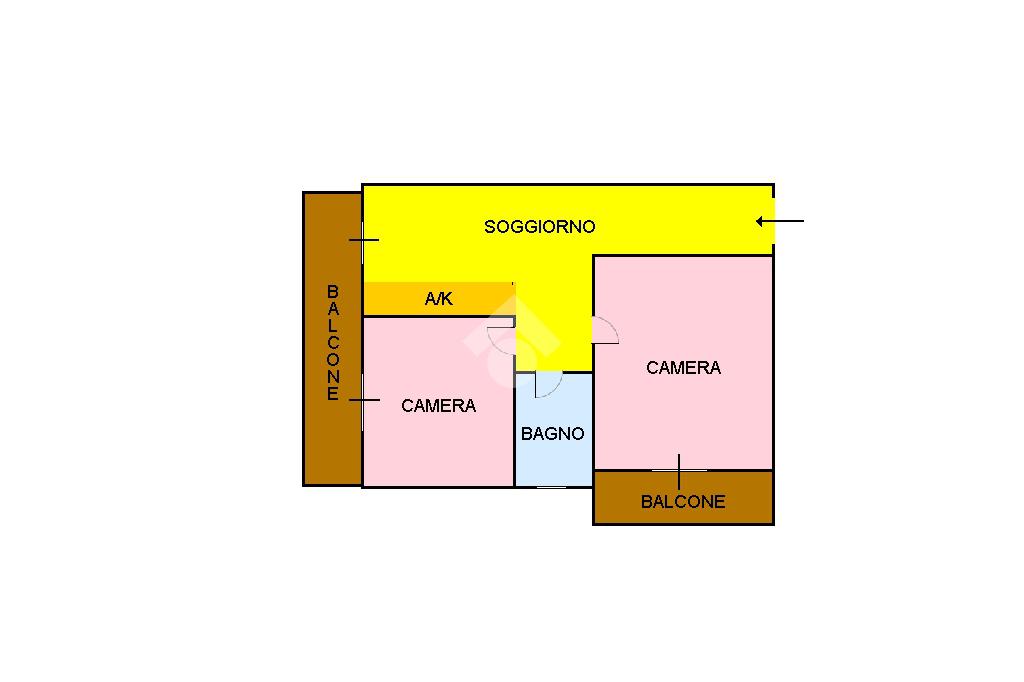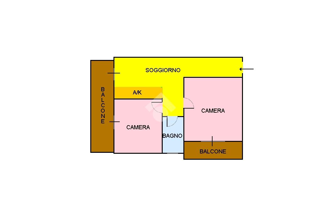 La distribuzione attuale prevede un soggiorno con angolo cottura, due camere da letto e un bagno.