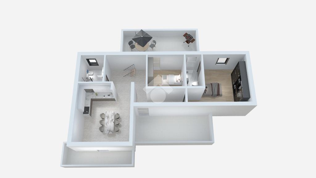 La zona notte ospita due camere da letto ben proporzionate e doppi servizi, garantendo comodità e privacy per tutta la famiglia.